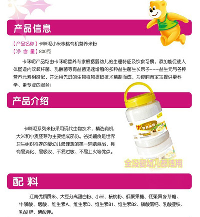 卡咪呢有機米粉系列是專為中國寶寶設(shè)計的營養(yǎng)輔食,選用有機大米,科學(xué)搭配維生素AD等維生素,還特別添加牛磺酸、DHA、AA等有助智力發(fā)育的營養(yǎng)成分,富含15種營養(yǎng)素,F(xiàn)上?ㄟ淠啬笅胗闷酚邢薰久嫦蛉珖瞻资袌鰠^(qū)域誠招卡咪呢有機米粉代理商。