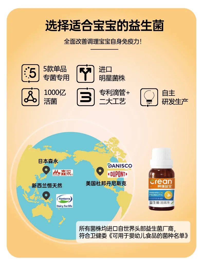 呵瑞益安短雙歧桿菌M-16V益生菌油滴液,采用進(jìn)口菌株,且選用菌株符合衛(wèi)健委【可用于嬰幼兒食品的菌種名單】。添加進(jìn)口原料,如瑞典AAK進(jìn)口油脂及進(jìn)口水溶性膳食纖維,安全配方,自主研發(fā)生產(chǎn),每瓶添加1000億活性益生菌,專利滴管,精準(zhǔn)控量,油滴嵌入包裹工藝+全程充氮保活工藝,牢牢鎖定活性。