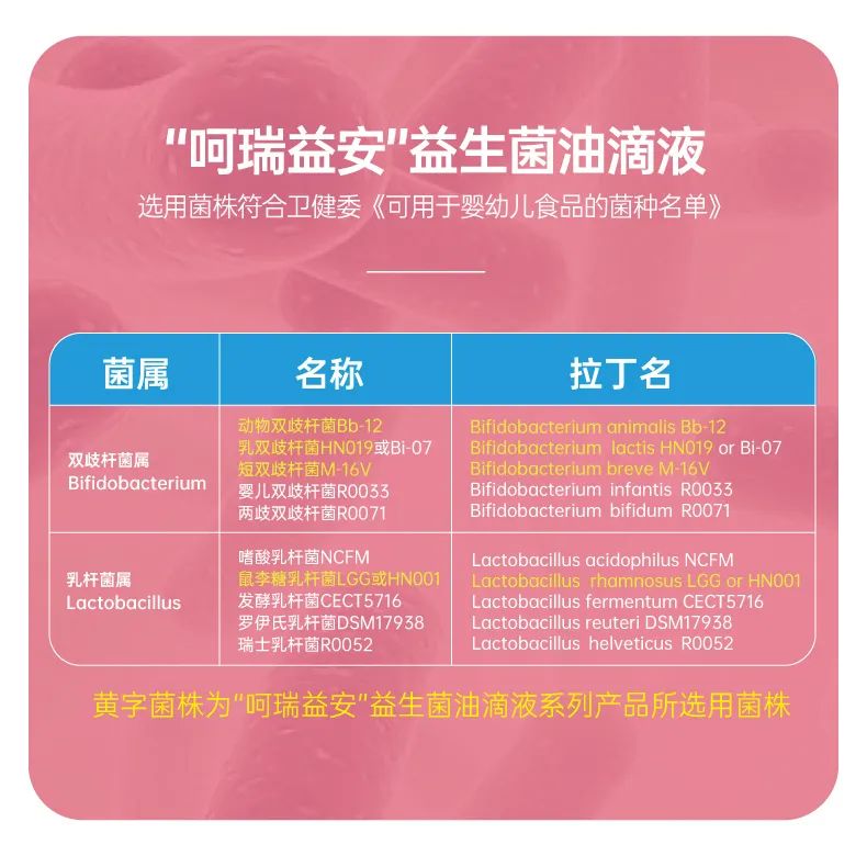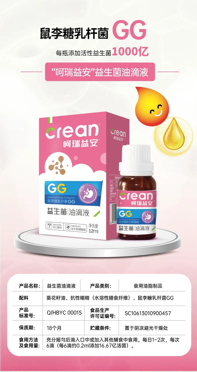 呵瑞益安鼠李糖乳桿菌GG益生菌油滴液,采用進(jìn)口菌株,且選用菌株符合衛(wèi)健委【可用于嬰幼兒食品的菌種名單】。添加進(jìn)口原料,如瑞典AAK進(jìn)口油脂及進(jìn)口水溶性膳食纖維,安全配方,自主研發(fā)生產(chǎn),每瓶添加1000億活性益生菌,專利滴管,精準(zhǔn)控量,油滴嵌入包裹工藝+全程充氮;罟に,牢牢鎖定活性。