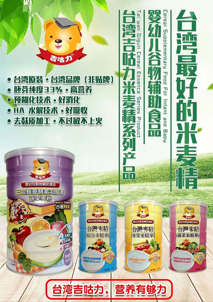 品牌名稱:吉咕力 主營產(chǎn)品:吉咕力嬰幼兒米麥精 品牌特色:濁水米配方 高端