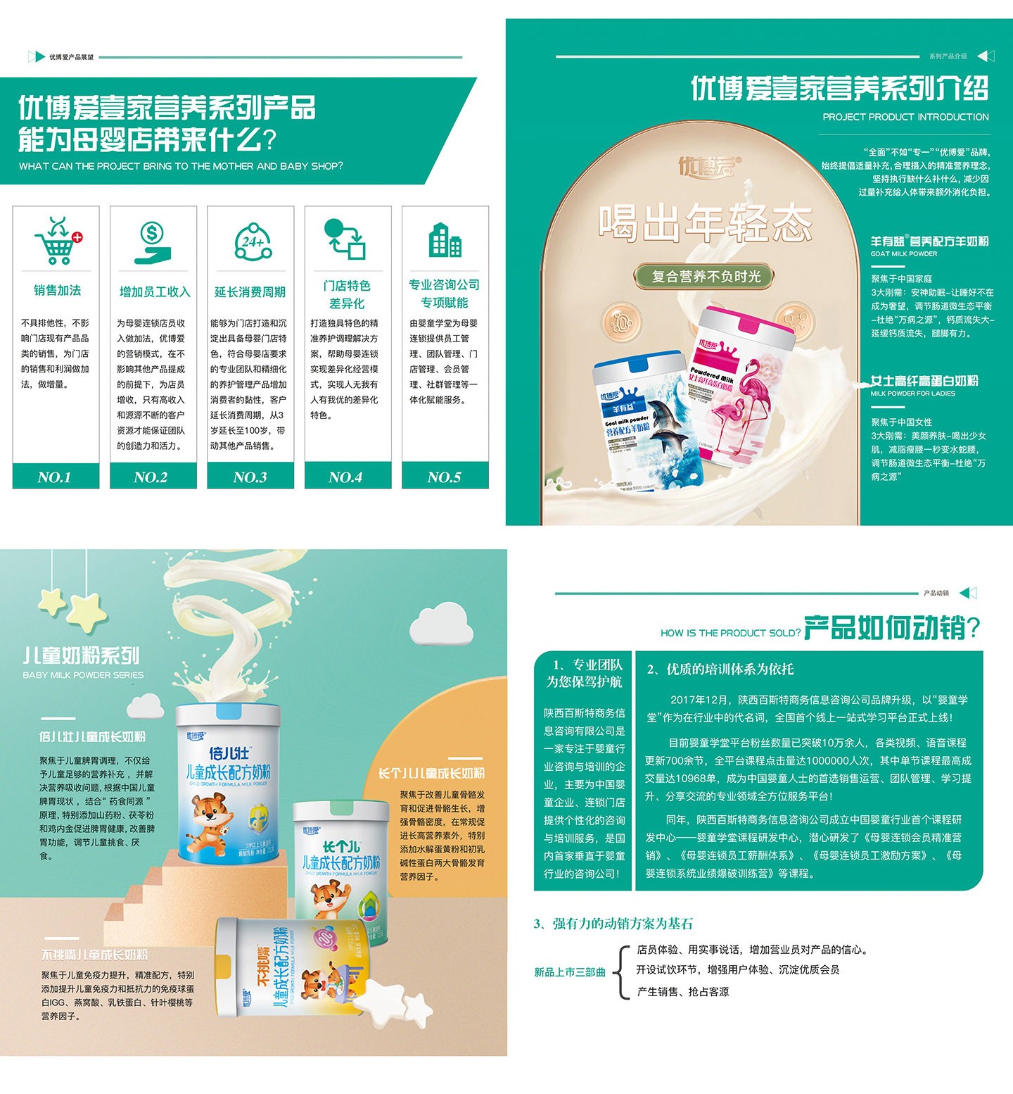 目前優(yōu)博愛旗下已擁有(不挑嘴、長個(gè)兒、倍兒壯)三款兒童成長奶粉、以及羊有益配方羊奶粉、高纖高蛋白女士奶粉。五款奶粉組合優(yōu)博愛壹家營養(yǎng)系列。