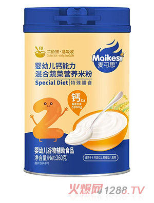 優(yōu)質(zhì)大米、全脂奶粉、大豆分離蛋白、濃縮乳清蛋白、白砂糖、胡蘿卜粉、南瓜粉、二十二碳六烯酸(DHA)、花生四烯酸(AA)、低聚果糖(FOS)、低聚半乳糖(GOS)、硫酸亞鐵、硫酸鋅、磷酸氫鈣、碘酸鉀、維生素A、維生素D、維生素B1、維生素B2、維生素B6、維生素B12、煙酸、葉酸、泛酸、維生素C、生物素